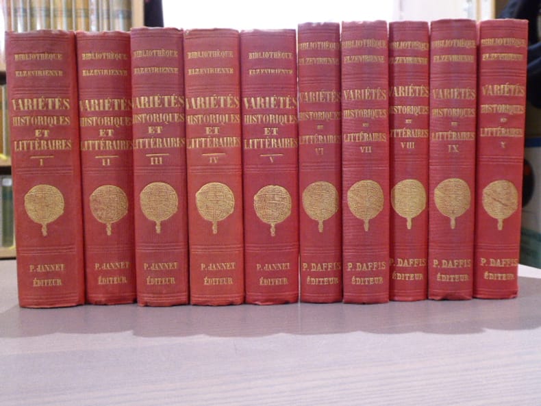 P. Jannet - "Bibliothèque Elzevirienne" Paris 1855 10 volumes in-12 ( 165 X 105 mm ) pleine percaline rouge, dos lisses titrés en lettres dorées et ornés de la sphère elzévirienne dorée, plats ornés de filets d'encadrement à froid. Belle édition imprimée sur beau papier, volumes non rognés. Agréable ensemble, bien complet en 10 volumes. BIBLIOTHEQUE ELZEVIRIENNE: Cette collection est un véritable monument de l'histoire de la librairie française.La collection complète ( 173 volumes ) est extrêmement difficile à constituer. Les textes qui la composent sont des ouvrages ou des manuscrits inédits ou très rares des XVe et XVIe siècles et par exception de quelques autres postérieurs au XVIIIe. Ces ouvrages contiennent les commentaires des plus grands érudits de l'époque. L'éditeur Pierre JANNET n'a reculé devant aucun sacrifice pour lancer sa collection. Ces jolies reliures en toile rouge à la manière anglaise ornées d'un globe doré feront le reste pour assurer la renommée de la Bibliothèque Elzévirienne.Tome I: 376 pages. Préface. Ensuit une remontrance touchant la garde de la librairie du Roy. Remontarnce de Jean Gosselin. Le Diogène françois. Histoires de deux magiciens. La chasse et l'amour. Nouvelle Caballe. Le triomphe de Betheleem Gabor. etc. Catalogue de la Bibliothèque Ezevirienne en fin d'ouvrage.Tome II: 372 pages. Mémoire sur l'Académie. Le Patissier de Madrigal en Espagne. Des Moulins à barbe. Histoire des Faulsetez de Francesco Fava. Remontrance aux Mariez et Mariées. L'ouverture des Jours gras, etc.Tome III: 367 pages. Placet des amants au Roy contre les voleurs de nuit et les filoux. Histoire prodigieuse d'un fantôme. La chasse au vieil Grognard. Le privilège d'avoir deux femmes. Les Ballieux d'ordures. Privilèges des Chastrez, etc.Tome IV: 367 pages. Réformation des mariages. Lettre d'erconiflerie. Estrange ruse d'un filou. Le pré au clercs. Les différents des coqs et des chapons. Procez des femmes du aux Bourg Saint Germain, etc.Tome V: 367 pages. Les triolets du temps. Reglement des Savetiers Cordonniers. Exil de Mardy-Gras. La misère des apprentis imprimeurs. Assemblée des Dames de Paris, etc.Tome VI: 351 pages. Estranges accidens arrivez sur la Loire. Le feu royal. La grande propriété des bottes. Harangue de Turlupin. Des finances de France. Le cochon mitré. etc.Tome VII: 367 pages. Plaisantes ruses de trois bourgeoises. Sibus. Le May de Paris. La grande division arrivée à Montpellier. Conspiration faite en Picardie. etc.Tome VIII: 352 pages. L'interrogatoire de Poltrot. Le faict du procez de Baif. La surprise et fustigation d'Angoulvent. La vie généreuse des Mercelots, Gueuz, etc.Tome IX: 368 pages. Le duel signalé d'un Portugais et d'un Espagnol. Deluge et Inundation. Description du tabkeau de Lustucru. Catalogue des Princes, Seigneurs. Le Bourgeois poli. Discours sur la vie, de la mort et des os du géant Theutobocus. La journée des dupes. etc.Tome X: 368 pages. L'Oeconomie ou le Vray Advis pour se faire bien servir. Réception des Ambassadeurs du Roi de Siam. La réjouissance des femmes sur la deffence des Cabarets. Le louis d'or. etc. Table des Matières contenues dans les 272 pièces formant les 10 volumes.