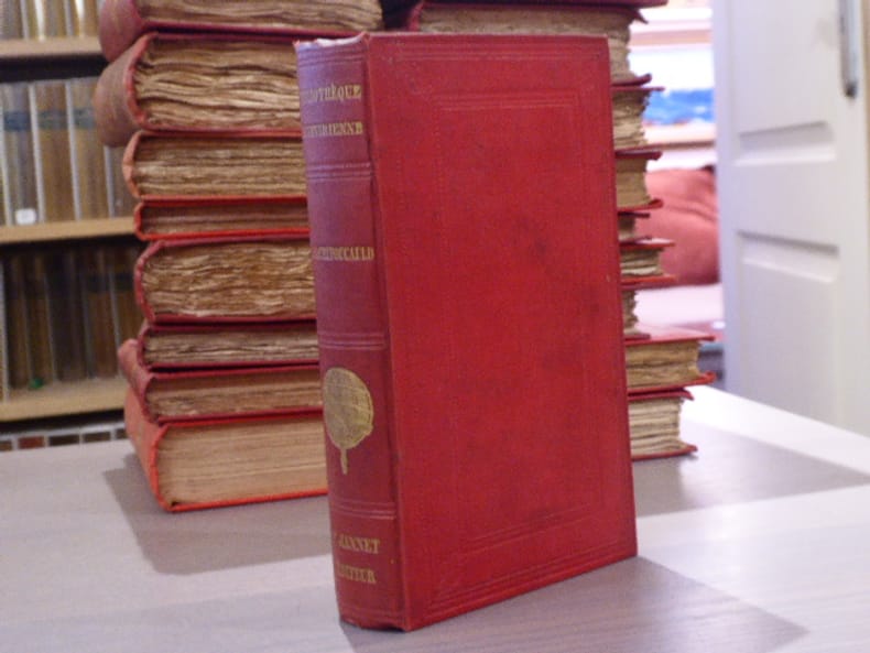 P. Jannet - "Bibliothèque Elzevirienne"- P. Daffis - Pagnerre Paris 1853 In-12 ( 165 X 105 mm ) de XXIV-320 pages, pleine percaline rouge, dos lisse titré en lettres dorées et orné de la sphère elzévirienne dorée, plats ornés de filets d'encadrement à froid. Belle édition imprimée sur beau papier, volume non rogné. Rousseurs passim, bon exemplaire.Nouvelle édition conforme à celle de 1678, et à laquelle on a joint les annotations d'un contemporain sur chaque maxime, les variantes des premières éditions et des notes nouvelles par G. DUPLESSIS.Avec une préface par C.-A. SAINTE-BEUVE.BIBLIOTHEQUE ELZEVIRIENNE: Cette collection est un véritable monument de l'histoire de la librairie française.La collection complète ( 173 volumes ) est extrêmement difficile à constituer. Les textes qui la composent sont des ouvrages ou des manuscrits inédits ou très rares des XVe et XVIe siècles et par exception de quelques autres postérieurs au XVIIIe. Ces ouvrages contiennent les commentaires des plus grands érudits de l'époque. L'éditeur Pierre JANNET n'a reculé devant aucun sacrifice pour lancer sa collection. Ces jolies reliures en toile rouge à la manière anglaise ornées d'un globe doré feront le reste pour assurer la renommée de la Bibliothèque Elzévirienne.