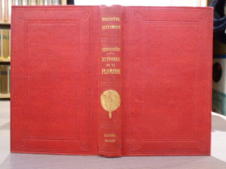 P. Jannet - "Bibliothèque Elzevirienne"- P. Daffis - Pagnerre Paris 1853 L'Histoire notable DE LA FLORIDE situee es Indes Occidentales. Contenant les trois voyages faits en icelle par certains Capitaines et Pilotes francois, descrits par le capitaine LAUDONNIERE, qui y a commandé l'espace d'un an trois moys: a laquelle a esté adjousté un quatriesme voyage par le Capitaine GOURGUES.In-12 ( 165 X 105 mm ) de IX-228 pages + 31 pages de catalogue, pleine percaline rouge, dos lisse titré en lettres dorées et orné de la sphère elzévirienne dorée, plats ornés de filets d'encadrement et de fleurons d'angles à froid. Belle édition imprimée sur beau papier, volume non rogné. Récit des tentatives d'établissement français en Floride au XVIe siècle, Fort Caroline, etc. Relié à la suite: Catalogue de la Bibliothèque Elzévirienne et des autres ouvrages du fonds de P. Jannet, 1855, 31p. rousseurs passim, bon exemplaire.BIBLIOTHEQUE ELZEVIRIENNE: Cette collection est un véritable monument de l'histoire de la librairie française.La collection complète ( 173 volumes ) est extrêmement difficile à constituer.Les textes qui la composent sont des ouvrages ou des manuscrits inédits ou très rares des XVe et XVIe siècles et par exception de quelques autres postérieurs au XVIIIe. Ces ouvrages contiennent les commentaires des plus grands érudits de l'époque.L'éditeur Pierre JANNET n'a reculé devant aucun sacrifice pour lancer sa collection.Ces jolies reliures en toile rouge à la manière anglaise ornées d'un globe doré feront le reste pour assurer la renommée de la Bibliothèque Elzévirienne.