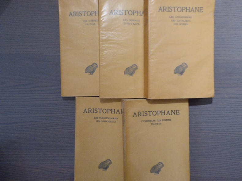 Les Belles Lettres Paris 1960 5 volumes in-8 ( 210 X 130 mm ) : I. Les Acharniens-Les Cavaliers-Les Nuées paginé XXXII-230,II. Les Guêpes - La Paix paginé 15-156,III. Les Oiseaux, Lysistrata paginé 21-177,IV. Les Thesmophories - Les Grenouilles paginé 15-157,V. L'Assemblée des Femmes Plutos paginé 12-147,brochés sous couvertures imprimées. Texte établi par Victor Coulon et traduit par Hilaire Van Daele. Texte en latin avec la traduction française en regard. Minimes décharges de papier collant sur les gardes. Beaux exemplaires.
