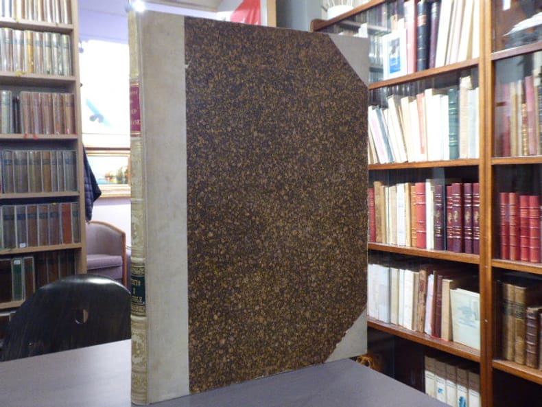 Tipografia Della S.C. De Propaganda Fide Roma 1861 In-plano ( 650 X 470 mm ) de 123 pages de texte et 51 planches, demi vélin ivoire à coins, dos à nerfs orné de caissons et fleurons dorés, pièces de titres de maroquin framboise et olive ( Reliure de l'époque ). Bel exemplaire de ce monumental ouvrage."Travail d'un grand prix.... Voulant faire honneur à une uvre si vénérable, il fut décidé que le palais de Latran serait transformé en musée pour la recevoir. Cétait dailleurs une occasion de dégager les galeries du Vatican autour du Sophocle, à qui était réservé le point central de lédifice, on disposerait bien des objets récemment découverts : statues, fragmens, bas-reliefs, toute sorte de richesses entassées dans les salles devenues trop étroites et qui demandaient la lumière. Le palais de Latran se prêtait parfaitement à ce dessein attenant à la basilique du même nom, situé non loin de la campagne romaine, tourné pour ainsi dire vers les âges disparus, il offrait un asile merveilleusement poétique à ces poétiques débris de lancien monde. Quelles harmonies naturelles, harmonies de lieux et de pensées, dans ce nouveau musée des antiques rassemblé ainsi.A Saint-Jean de Latran, en face des déserts!Ainsi fut créé le musée grégorien de Latran, ou plus simplement le musée de Latran, puisque ce nom de musée grégorien est aujourdhui attribué par lusage à la collection étrusque du Vatican. A peine installé, et pendant quil senrichissait encore des fouilles exécutées sur plusieurs points du territoire, ce musée, ou plutôt ce temple consacré à Sophocle, attirait lattention des archéologues. M. Henri Brunn en parlait dans le Kunstblatt M. Braun, dans ses Ruines et Musées de Rome, étudiait avec soin quelques-uns de ses monumens enfin Grégoire XVI, pour compléter son uvre, ordonnait la publication dune vaste monographie où tous les objets du musée de Latran seraient examinés, classés, décrits, avec lindication de leur provenance. Ce travail, confié dabord aux soins du père Marchi, fut transmis bientôt au père Secchi, et, après la mort de ce dernier, au père Garrucci, qui le publia en 1861 sous ce titre : Monumenti del museo lateranense descritti ed illustrati da Raffaele Garrucci e pubblicati per ordine della santità di nostro signore papa Pio IX. ( Revue des Deux Mondes - 1868 - tome 73 - Page 537-338 ).