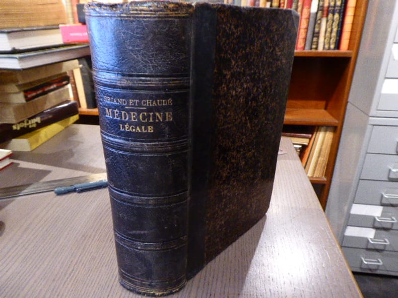 J.B Baillière Et Fils Paris 1869 Fort in-8 ( 240 X 160 mm ) de 1087 pages, broché sous couverture illustrée. Précédé de Considérations sur la Recherche et la Poursuite des Crimes et des Délits sur les Autorités qui ont le droit de requérir l'assistance des Médecins ou des Chirurgiens, sur la distinction établie par la loi entre les Docteurs et les Officiers de santé sur la matière de procéder aux Expertises médico-légales, sur la rédaction des Rapports et des Consultations, sur les cas où les hommes de l'art sont responsables des faits de leur pratique, et sur les honoraires qui leur sont dus, soit en justice, soit dans la pratique civile suivi de Modèles de Rapports, et de Commentaires sur les Lois, Décrets et Ordonnances qui régissent la Médecine, la Pharmacie, la vente des Remèdes secrets, etc par J. BRIAND et Ernest CHAUDE. Et un Traité Elémentaire de chimie légale par J. BOUIS. Bon exemplaire
