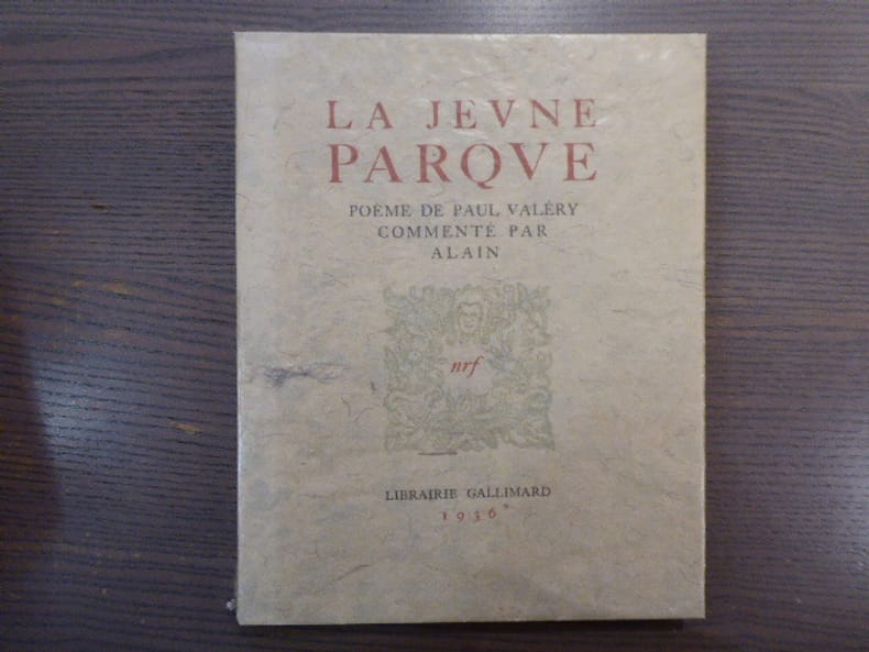 Paris Librairie Gallimard NRF 1936 in 8 (24x19) 1 volume broché, couverture rempliée, LV et 76 pages [2], non rogné, étui décoré de l'éditeur. Poème de Paul Valéry commenté par Alain, avec un prologue inédit d'Alain " Le Philosophe et la Jeune Parque ". Tirage limité à 1060 exemplaire numérotés, celui-ci un des 1010 exemplaires numérotés sur papier vergé d'Arches blanc (après 15 chine, 25 hollande, et 50 montval). Bel exemplaire ( Photographies sur demande / We can send pictures of this book on simple request )