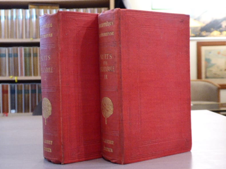 P. Jannet - "Bibliothèque Elzevirienne" Paris 1857 2 volumes in-12 ( 165 X 105 mm ) de LXII-384 et 408 pages, pleine percaline rouge, dos lisses titrés en lettres dorées et ornés de la sphère elzévirienne dorée, plats ornés de filets d'encadrement à froid. Belle édition imprimée sur beau papier, volumes non rognés. Bel ensemble. BIBLIOTHEQUE ELZEVIRIENNE: Cette collection est un véritable monument de l'histoire de la librairie française.La collection complète ( 173 volumes ) est extrêmement difficile à constituer. Les textes qui la composent sont des ouvrages ou des manuscrits inédits ou très rares des XVe et XVIe siècles et par exception de quelques autres postérieurs au XVIIIe. Ces ouvrages contiennent les commentaires des plus grands érudits de l'époque. L'éditeur Pierre JANNET n'a reculé devant aucun sacrifice pour lancer sa collection. Ces jolies reliures en toile rouge à la manière anglaise ornées d'un globe doré feront le reste pour assurer la renommée de la Bibliothèque Elzévirienne.