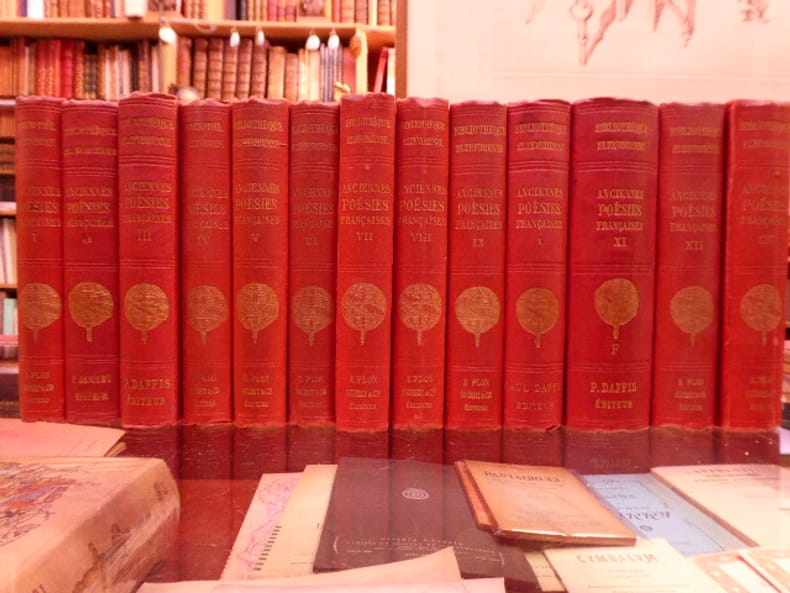 P. Jannet - "Bibliothèque Elzevirienne"- P. Daffis - Pagnerre Paris 1855 13 volumes in-12 ( 165 X 105 mm ) pleine percaline rouge, dos lisses titrés en lettres dorées et ornés de la sphère elzévirienne dorée, plats ornés de filets d'encadrement à froid. Belle édition imprimée sur beau papier, volumes non rognés. Dos légèrement éclaircis, agréable ensemble, bien complet en 13 volumes. Cette série publiée en 13 volumes de 1855 à 1878. Ces pièces sont toutes rarissimes, quasiment jamais réimprimées et presque toujours anonymes. BIBLIOTHEQUE ELZEVIRIENNE: Cette collection est un véritable monument de l'histoire de la librairie française.La collection complète ( 173 volumes ) est extrêmement difficile à constituer. Les textes qui la composent sont des ouvrages ou des manuscrits inédits ou très rares des XVe et XVIe siècles et par exception de quelques autres postérieurs au XVIIIe. Ces ouvrages contiennent les commentaires des plus grands érudits de l'époque. L'éditeur Pierre JANNET n'a reculé devant aucun sacrifice pour lancer sa collection. Ces jolies reliures en toile rouge à la manière anglaise ornées d'un globe doré feront le reste pour assurer la renommée de la Bibliothèque Elzévirienne.