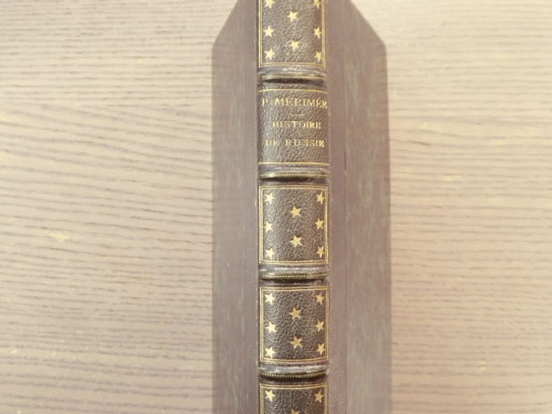 Intéressante péripétie de l'histoire russe relatée avec le style puissant de Mérimée. Contrefaçon belge parue l'année de l'originale. Elle est ornée de couvertures grises illustrées, de 2 frontispices et de 2 planches hors texte. Bon exemplaire dans le cartonnage d'éditeur illustré, malgré les coiffes et les dos frottés.- Vicaire IV, 733 (pour l'édition originale).