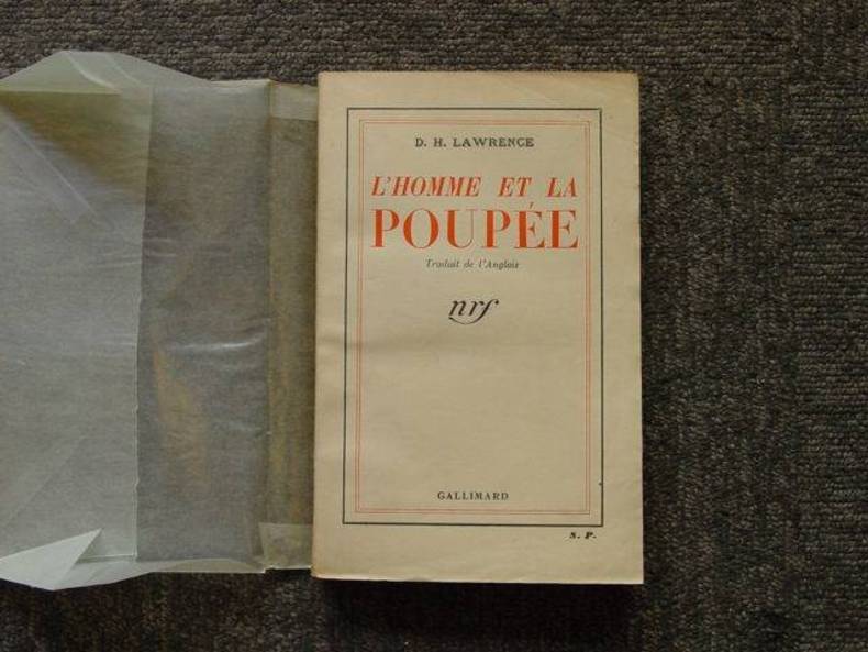 "Édition originale de la traduction française du long récit L'Homme et la poupée et des six nouvelles complétant le recueil, traduction partagée entre A. Morice-Kerné et Colette Vercken. Unique tirage sur grand papier de 367 exemplaires sur alfa Lafuma-Navarre sous couverture spéciale de la collection ""Du Monde Entier""; un des 67 hors-commerces marqués S.P., celui-ci n°1. Contrairement à ce qu'on pourrait supposer hâtivement, l'homme et la poupée du récit éponyme (publié en 1923 sous le titre The Captain's Doll) ne font qu'un, puisqu'après la poupée Alma Mahler créée pour Kokoschka en 1918 et une bonne décennie avant les premières expérimentations de Bellmer dans les années 1930, Lawrence aborde ce fétiche en inversant le point de vue: c'est ici le jeune officier anglais qui se trouve ""chosifié"" par sa maîtresse, aristocrate ruinée dont la fabrication de poupées constitue le gagne-pain. Une autre façon de concevoir le titre et sa traduction eut donné quelque chose comme ""La femme et le pantin"" mais, hélas, Pierre Louÿs l'avait trouvé avant. Exemplaire à l'état de neuf."