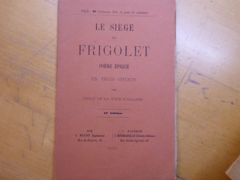 Se trouve à l'Abbaye de St -Michel-de-Frigolet, 1892, une plaquette reliure demi-chagrin à coins, titre, auteur, fleuron et filets dorés, 35 pages, couvertures conservées. La plaquette est en état moyen (petits manques aux couvertures, et trace de pliure verticale), mais la reliure, signée Flammarion Vaillant, est en très bon état.