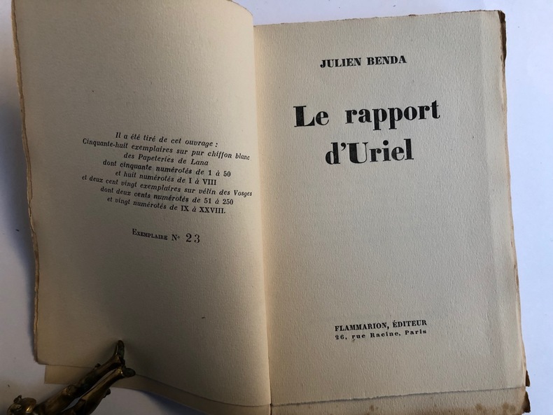 Coll. "Essai" n° 49, éd. Babel - Actes Sud, 1992, in-12, cartonnage souple, couv. ill. coul. éd., 174 pp., lecture de Philippe D. Dracodaïdis, table, "Dieu s'étant laissé dire que sur une petite boule de son empire s'agitait une étrange espèce, dite humaine, et n'ayant pas le temps d'y aller voir, chargea l'un de ses anges de s'y rendre, de s'enquérir et de lui adresser un rapport. Nous publions de ce rapport quelques fragments qui nous sont tombés sous les yeux." Tel est l'ironique stratagème imaginé par Julien Benda, polémiste impénitent et penseur rebelle aux modes, pour livrer - dans cet ouvrage dont la première édition date de 1946 - quelques-unes de ses propres observations sur les cercles intellectuels, religieux ou politiques de la France d'alors. Un pamphlet à redécouvrir, où l'on retrouve la pensée roborative et la verve impitoyable d'un esprit qui n'a rien perdu de sa modernité." Très bon état