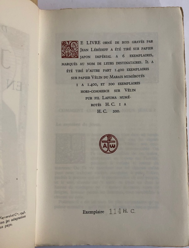Orné de bois gravés par Jean Lébédeff. Exemplaire n° 108 h.c. / 200 tiré sur vélin pur fil Lafuma. Classification Dewey : 200-RELIGION