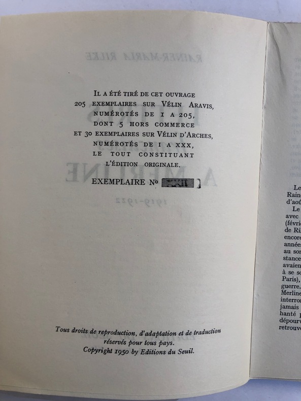 Paris. Editions du Seuil. 1950. Petit in-8. Br. 188 p. + une photo de la tombe de Rilke. BE.