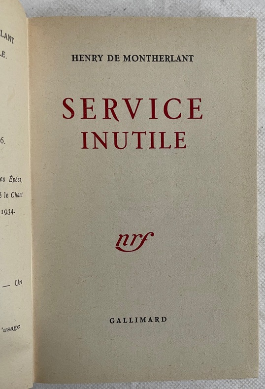 Edition originale, un des exemplaires du service de presse. Petites piqûres sur le dos légèrement insolé. Précieux envoi autographe signé d'Henri de Montherlant : "A Charles Maurras avec mon ancienne admiration." - Photographies et détails sur www.Edition-Originale.com -
