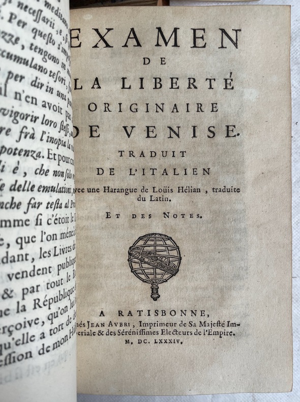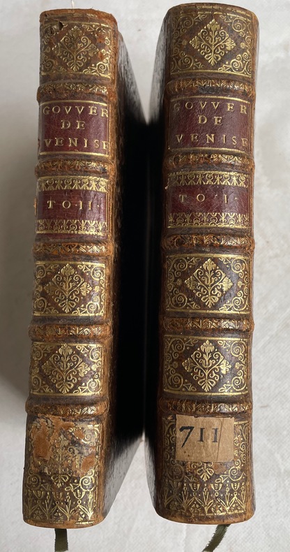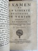 Relié avec "Examen de la liberté originaire de Venise". Traduit de l'italien avec une harange de Louis Hélian, traduite du latin. Et des notes. A Ratisbonne, chez Jean Aubri, 1684. 184 pages. Reliure époque plein veau tabac, dos à nerfs orné de caissons et fleurons, dorés, pièce de titre maroquin rouge, pièce de tomaison maroquin rouge, titre doré… T.2 : dos un peu frotté en pied. ex-libris sur étiquette imprimée "Levrier".