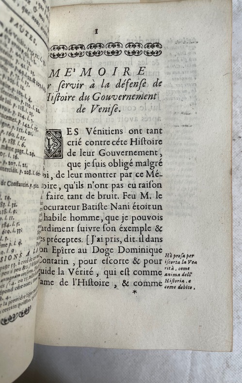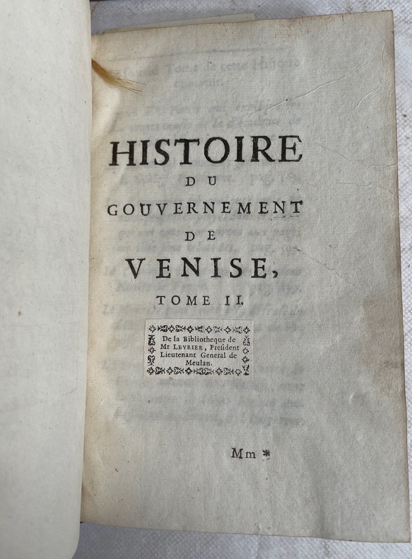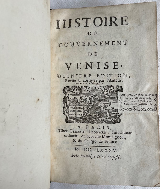 1685 A Paris, chez F. Léonard, 1685. Deux volumes in-8, 15 feuillets non chiffrés (titre, épitre, préface et privilège), 685 pages plus table des matières et 16 pages (mémoire). Reliure époque plein veau blond, dos à nerfs orné de caissons et fleuros, dorés, pièce de titre maroquin rouge, pièce de tomaison maroquin havane, titre doré. Coiffes supérieures à peine usées, coins émoussés, trace de brulure sur un plat. Relié avec "Examen de la liberté originaire de Venise". Traduit de l'italien avec une harange de Loüis Hélian, traduite du latin. Et des notes. A Ratisbonne, chez Jean Aubri, 1684. 184 pages.