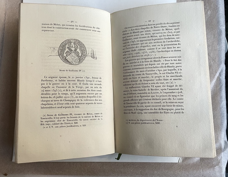 C'est avec un grand réalisme que l'auteur aborde sa monographie : "Peu de villages sont aussi inconnus que Blandy .." Sise dans le département de Seine-et-Marne, la localité de Blandy abritait en effet un puissant château ayant appartenu aux vicomtes de Melun, mais qui tombait en ruines depuis le XVIIe siècle (il ne fut restauré qu'à partir de 1992 et son acquisition par le Conseil général). Alphonse-Honoré Taillandier (1797-1867) possédait une maison en face de cette ruine, et c'est ce qui lui donna l'idée de composer cette notice, la première rédigée sur les sources. - - VENTE PAR CORRESPONDANCE UNIQUEMENT