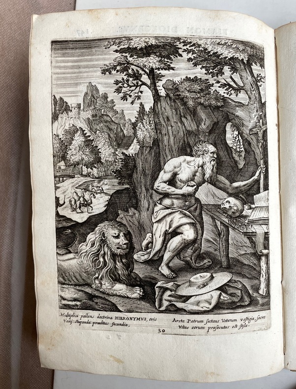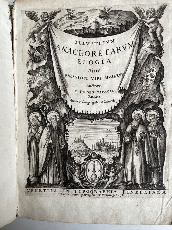 Venise, Pinelli, 1625. In-4, reliure de vélin, dos orné, titre à l'encre, reliure d'époque. L'illustration se compose d’un titre-frontispice, d’une vue de Bassano prise du couvent de S. Fortunato, dans laquelle est également représenté le célèbre pont - la première gravure par ordre chronologique de Bassano avec le monogramme LP et de 31 planches à pleine page représentant des ermites et anachorètes entourés d'une nature sauvage.