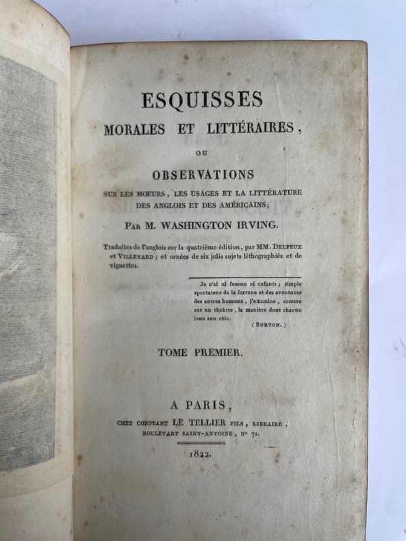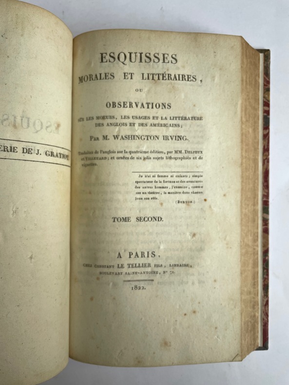 Première édition française illustrées de 6 lithographies d'après les dessins d'Arago et de nombreux culs de lampe. Reliure restaurée : plats et gardes conservés, dos refait, dos ancien collé sur le dos refait. Édition originale de la traduction française, ornée de 6 lithographies d'après Arago, des contes fantastiques et folkloriques de Washington Irving (1783-1859), premier écrivain américain à avoir publié un ouvrage conjectural dit Versins, p. 457. L'ouvrage contient notamment le conte Rip van Winckle (t. I, pp. 47-77), inspiré par la légende d'Épiménide, et celui intitulé Légende de la vallée somnifère (t. II, pp. 271-326) que Tim Burton adaptera avec brio au cinéma sous le titre Sleepy Hollow : légende du cavalier sans tête (1999). Quelques rousseurs.