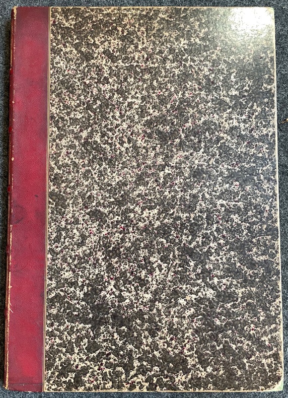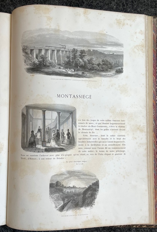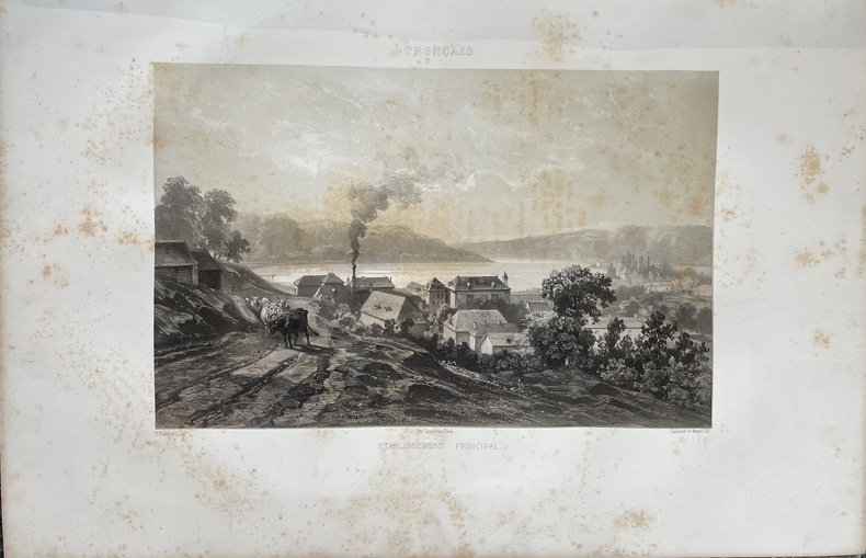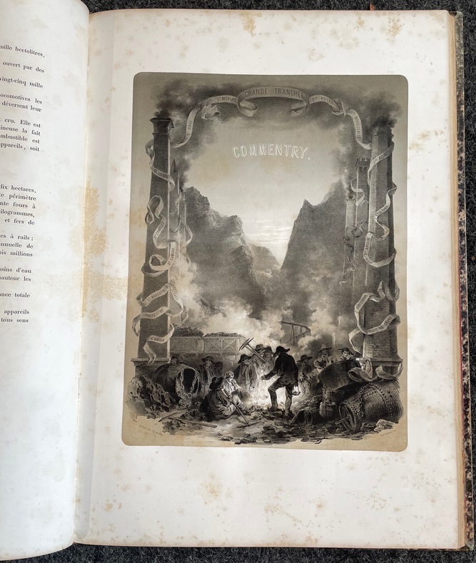 Ce fameux album, dont la rareté est légendaire, n'a été tiré qu'à cent exemplaires. Les superbes compositions de Tudot lithographiées par Sabatier et Bayot, tirées sur les presses parisiennes de Lemercier, montrent l'aspect industriel de la région : paysages modelés par l'industrie, bâtiments techniques, une scène de distribution du charbon pierreux aux ouvriers... mais aussi les demeures de maîtres (Montassiégé, St.-Front...). Deux vues sont consacrées à Montluçon et une à Néris, toutes proches. Titre illustré d'une vignette, un feuillet d'introduction avec 3 vignettes gravées sur bois. Titre courant "Tronçais", un feuillet de texte avec 3 gravures, 5 planches présentant 7 vues ; titre courant "Commentry", un spectaculaire frontispice allégorique tiré sur un fond sombre, un feuillet de texte avec 3 vignettes, 9 planches présentant 13 vues ; titre courant "Montluçon", un feuillet de texte avec une vignette, 2 planches. Titre courant "Néris", un feuillet de texte avec 3 vignettes, une planche. Titre courant "Montassiégé", un feuillet de texte avec 3 vignettes, 5 planches. Texte et gravures sont tirés sur papier fort. - Intérieur impeccable, parfaitement lavé, tissu des plats renouvelé. La planche à deux sujets : "Établissement de Tronçais - Forges de Morat" est détachée.