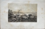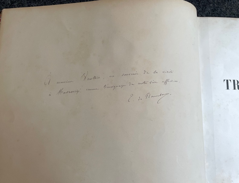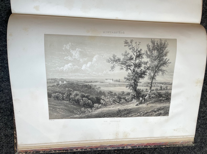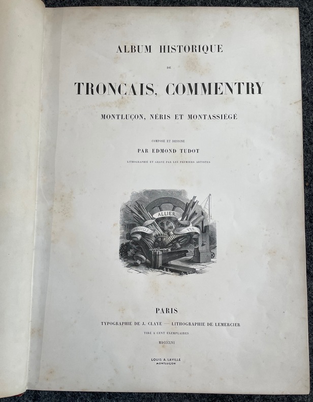 Album, d'une rareté insigne : il n'a été tiré qu'à cent exemplaires. Les compositions de Tudot lithographiées par Sabatier et Bayot, tirées sur les presses de Lemercier. Deux vues sont consacrées à Montluçon et une à Néris, toutes proches. Titre illustré d'une vignette, un feuillet d'introduction avec 3 vignettes gravées sur bois. Titre courant "Tronçais", un feuillet de texte avec 3 gravures, 5 planches présentant 7 vues ; titre courant "Commentry", un frontispice allégorique tiré sur un fond sombre, un feuillet de texte avec 3 vignettes, 9 planches présentant 13 vues ; titre courant "Montluçon", un feuillet de texte avec 3 vignette, 2 planches. Titre courant "Néris", un feuillet de texte avec 3 vignettes, une planche. Titre courant "Montassiégé", un feuillet de texte avec 3 vignettes, 5 planches. Texte et gravures sont tirés sur papier fort. - Exemplaire non lavé, resté tel quel : des rousseurs sur les marges. Envoi de M. de Rambourg, propriétaire de Montassiégé ; il semble probable que ce dernier est participé financièrement à cette édition confidentielle.