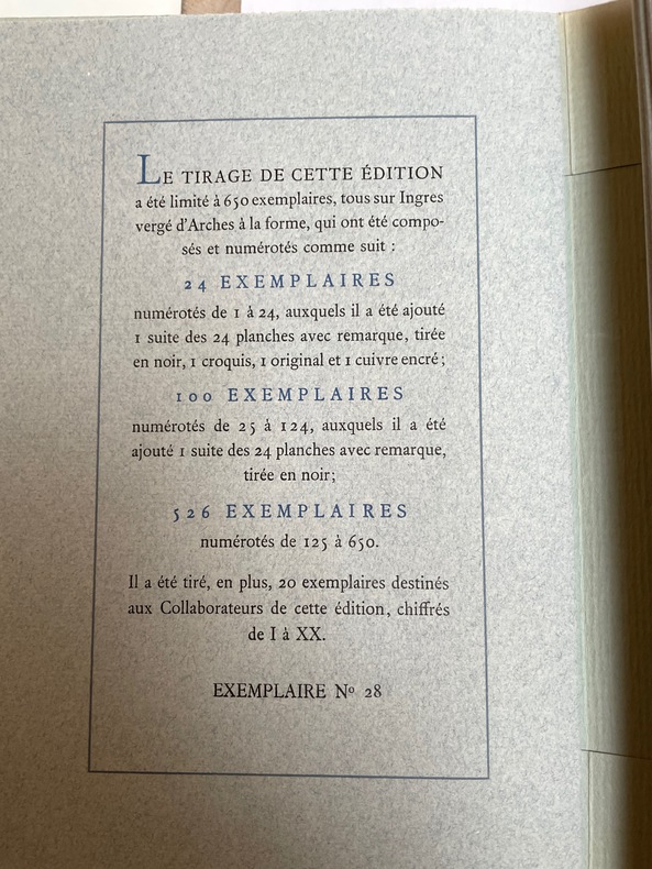 Tirage limité à 650 exemplaires, tous sur Ingres vergé d'Arches à la forme ; exemplaire n°28 sur papier bleuté, comprenant une suite en noir avec remarques.