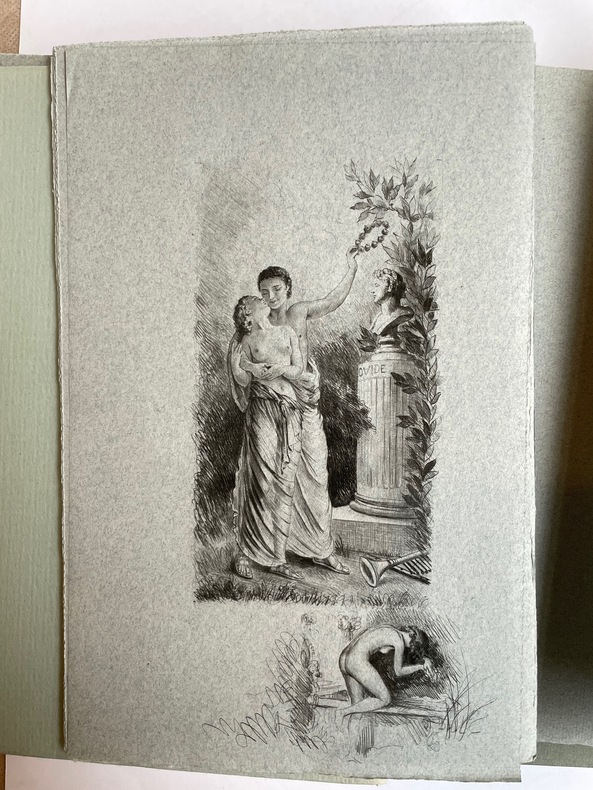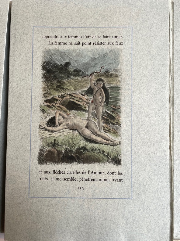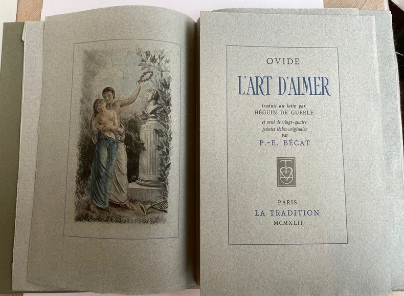 Tirage limité à 650 exemplaires, tous sur Ingres vergé d'Arches à la forme; exemplaire n°217 comprenant une aquarelle originale de Paul-Emile BECAT signée en bas à droite, p.73 représentant, vraisemblablement Ulysse et Calypso enlacés. Illustré de 24 pointes sèches originales en couleurs par Paul Emile Bécat, protégées de serpentes. Traduit du latin par HEGUIN de GUERLE. Ovide, né en 43 avant J-C, est un poète latin du siècle d'Auguste. Dans ce long poème, Ovide conseille, dans "L'art d'aimer", les hommes sur leur apparence physique, afin qu'il puissent séduire les femmes. Ses écrits sont une des causes de son exil par l'empereur Auguste. Ses affirmations sont illustrées d'exemples précis venant de la mythologie. L'auteur ne néglige rien sur l'art de l'amour et de la séduction. L'art d'aimer est un des textes érotiques les plus connus du monde. Paul- Emile BECAT (1885-1960) , peintre, graveur et dessinateur français, se spécialise dès 1933, dans la technique de la pointe sèche qu'il met au service de textes érotiques et galants. Notre aquarelle originale dévoile avec beaucoup de délicatesse le talent de l'artiste à illustrer ce petit bijou de la littérature latine sur une étreinte d'Ulysse et de Circé. Légères usures et déchirures à l'étui.