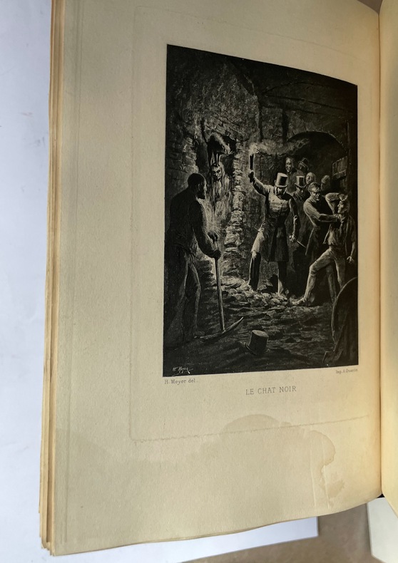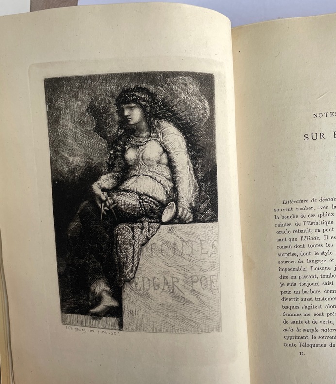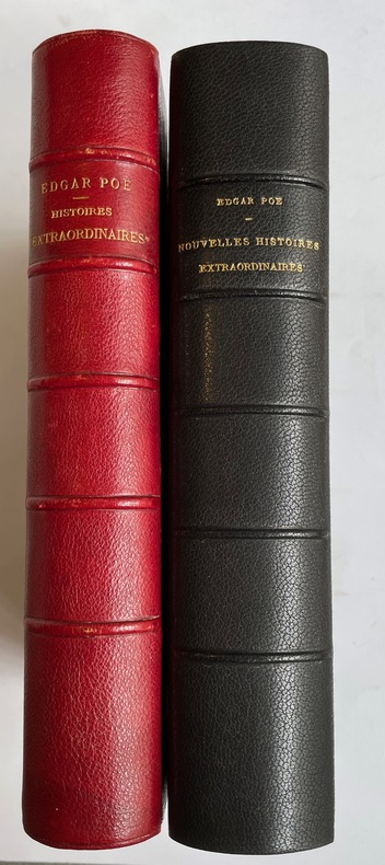 Pour le tome 1 Histoires extraordinaires le portrait de Poe, dessiné et gravé par Chifflart ; eau-forte de Abot d'après Vierge ; 2 héliogravures d'après les dessins de Férat et Herpin ; 9 dessins et eaux-fortes de Wögel ; Pour le tome 2 Nouvelles histoires extraordinaires : frontispice dessiné et gravé par Chifflart ; 4 héliogravures d'après les dessins de Meyer, Férat, F. Méaulle et J.P. Laurens ; 8 eaux-fortes d'après Wögel. Les hors-texte du tome 2 sont en deux états (un sur vergé et un avant la lettre sur japon) ; la gravure sur vergé illustrant "le chat noir" a une mouillure claire en marge inférieure (cf photo) Cet exemplaire est sur japon (non composté) Reliure tome 1 : demi chagrin rouge coins, tête dorée, Couvertures conservées, reliure d'époque, ex-libris sur le contre-plat et cachet humide sur la couverture et le faux-titre. Reliure tome 2 : demi maroquin bronze foncé à coins tête dorée, Couvertures conservées, reliure moderne signée P. Goy et C. Vilaine Première édition illustrée, très recherchée, donnée par A. Quantin en 1884,