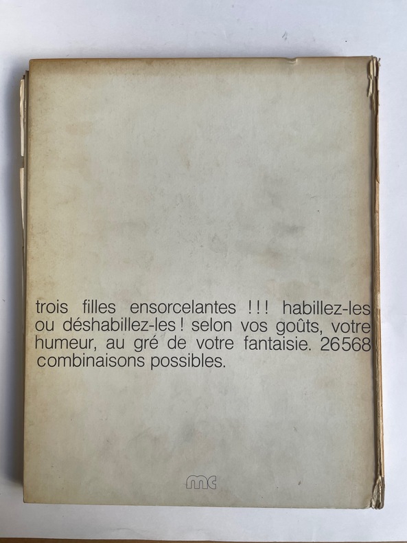 Édition originale, 1970. Livre à système, avec plusieurs photos sur spirale se combinant un peu comme 1000 milliards de poèmes. Couvertures salies et charnières fendues, sinon bon état intérieur. "Trois filles ensorcelantes !!! habillez-les ou déshabillez-les! selon vos goûts, votre humeur, au gré de votre fantaisie. 26568 combinaisons possibles."