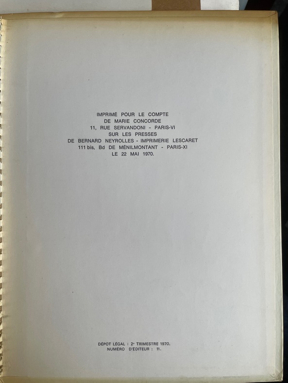 Paris, Marie Concorde Editeur, 1970, 1ère et unique édition, 36 pages illustrées de photos (3 pleine page, toutes les autres feuilles coupées horizontalement en 2 ou 3), couvertures originales illustrées de photos, reliure spirale interne, in-quarto (28,1 x 22,3 cm).