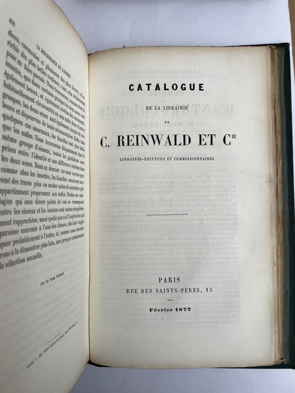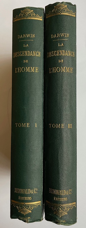 Tome I : C. Reinwald, 1872. in-8 2 ff.n.ch., 452 pp., 24 pp. de catalogue de libraire (Première édition française) Tome 2 : Paris C. Reinwald et Cie, Libraires-Editeurs 1874 ; 507 pages. Revue par Edmond Barbier d'après la seconde édition anglaise revue et augmentée par l'auteur. Préface par Carl Vogt. (Deuxième édition française.)