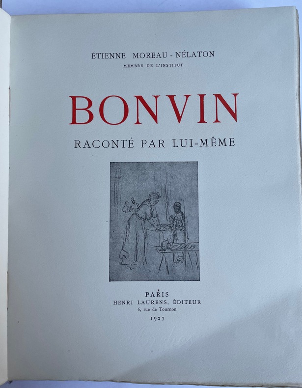 Moreau-Nélaton, Etienne.Bonvin raconté par lui-même.Paris. Henri Laurens. 1927. In-4°, reliure demi-cuir, tête dorée, usures en coins, un mors restauré, intérieur frais, 153 pages. 102 hors-texte héliogravures. Edition limitée à petit nombres, couvertures et dos conservés