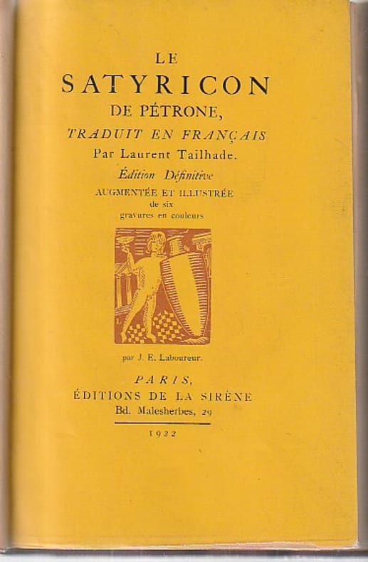 Le Satyricon de Pétrone, traduit par Laurent Tailhade. Nouvelle édition revue, corrigée, augmentée et illustrée de six gravures en couleurs par J. E.Laboureur. (Paris: Edition de la Sirène, 1922). [M.C.: Littérature latine, livre illustré moderne]
