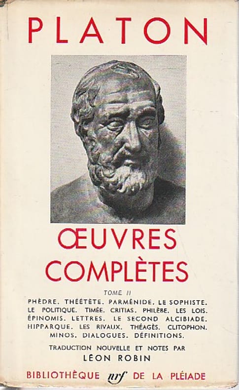 Trad. du grec ancien par Joseph Moreau et Léon Robin . Édition de Léon Robin avec la collaboration de Joseph Moreau, Gallimard, Bibliothèque de la Pléiade, 1950, 1671 pages, relié, jaquette un peu abimée, sans boîtier, traces d'usage, passages signalés au crayon, état correct.