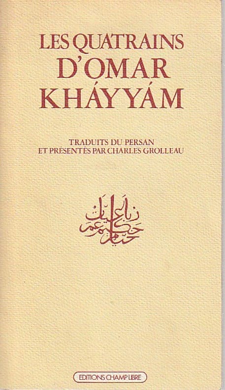 Paris, Charles Carrington, 1902. In-8 carré de 158 pages et un feuillet (table et achevé d'imprimer). Les Quatrains sont traduits du persan sur le manuscrit conservé à la Bodleian Library d'Oxford et publiés avec une Introduction et des Notes par Charles Grolleau. Le texte est entièrement orné d'un large motif sépia en encadrement. Tirage à 500 exemplaires. Le nôtre est non mis dans le commerce, sur vergé d'Arches et destiné à Monsieur Léon R.. avec envoi de l'éditeur. Exemplaire non émargé. Excellent état intérieur. Broché, couvertures vert foncé et rempliées. Large titre en lettres d'or sur le premier plat, dos muet. En très bon état.
