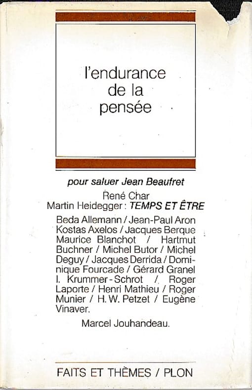 Paris Plon, coll. "Faits et Thèmes" 1968 1 vol. relié in-8, cartonnage de l'éditeur, 357 pp., 3 planches hors-texte, bibliographie. Edition originale. Contient la traduction originale de la conférence "Temps et Etre" de Heidegger par François Fédier, des hommages de Char et Jouhandeau, et des études par Axelos, Blanchot, Butor, Deguy, Derrida, Granel, Laporte, Munier, etc. Sans la jaquette. Sinon bon état.