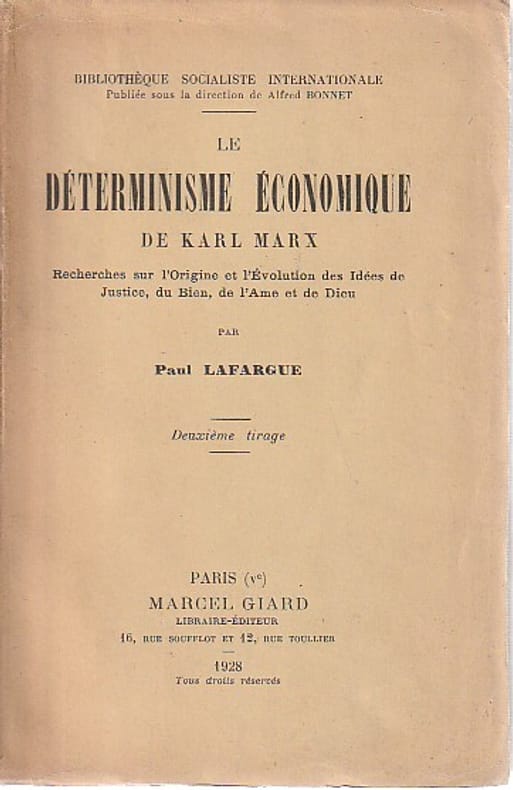 Paris V. Giard & E. Brière, Libraires-Editeurs 1909 in 12 (18x11,5) 1 volume reliure toilée noire ancienne, dos lisse titré en lettres dorées, avec en queue: Cercle de la Libératrice, 384 pages. Paul Lafargue, Santiago de Cuba 1842 - Draveil 1911, journaliste, économiste, écrivain et homme politique socialiste français. Collection '' Bibliothèque socialiste internationale ''. Bon exemplaire ( Photographies sur demande / We can send pictures of this book on simple request )