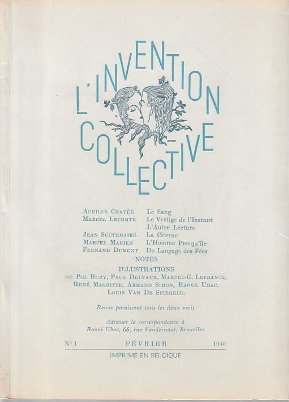 Revue paraissant tous les deux mois, dirigée par Raoul Ubac. N° 1 et 2. [Jette, Impr. René-J. Stenuit], 1940, (17,1 x 23,3 cm), 2 volumes brochés de 16 et 22 pages.L'Invention collective est une revue surréaliste publiée en 1940 à Bruxelles. L'Invention collective, « revue paraissant tous les deux mois », est fondée en 1940 à Bruxelles par René Magritte et Raoul Ubac. Il est précisé sur la couverture : « adresser la correspondance à Raoul Ubac, 66 rue Vandernoot » (Molenbeek-Saint-Jean).La revue connaît deux numéros, en février et avril. L'invasion de la Belgique par l'armée allemande le 10 mai 1940 met fin à son activité, Agui (Agathe) et Raoul Ubac quittant Bruxelles avec Magritte pour Carcassonne où les rejoignent Louis Scutenaire et Irène Hamoir. Le nom de la revue reprend le titre, donné par Paul Nougé, d'une peinture de Magritte datant de 1935. Le premier numéro de la revue rassemble des textes d'Achille Chavée, Marcel Lecomte, Louis Scutenaire qui signe alors Jean Scutenaire, Marcel Mariën et Fernand Dumont. Les illustrations sont de Pol Bury, Paul Delvaux, Marcel-G. Lefrancq, René Magritte, Armand Simon, Raoul Ubac et Louis Van De Spiegele. Collaborent ainsi à ce numéro des membres des deux groupes surréalistes de Belgique, le groupe de Bruxelles (Lecomte, Scutenaire, Mariën, Magritte, Ubac), et celui du Hainaut (Bury, Chavée, Dumont, Lefranc, Simon, Van De Spiegele). Dans une lettre de décembre 1939 Magritte avait adressé à Scutenaire un projet de texte « comme déclaration » destiné à ce premier numéro, en lui proposant de « quand même broder sur ce thème ou sur un autre ». Une « circulaire » datée du 17 décembre, signée par Chavée, Magritte, Mariën et Scutenaire, est le premier jet de l'annonce, en janvier 1940, de la publication de la revue, suivie d'un prospectus : « [...] Avant tout, ce qu'il nous importe de garder intact c'est cet état d'esprit que le surréalisme aura créé sous forme de précipité poétique [...] En publiant cette revue, nous pensons rompre le silence auquel la guerre contraint nos amis anglais et français. En Belgique, il nous reste quelques chances de nous faire entendre. [...] »Le second numéro de la revue rassemble des textes de Pierre Mabille, André Breton, Irène Hamoir, Paul Magritte, Marcel Mariën, René Magritte, Jean Scutenaire, Achille Chavée, Raoul Ubac, Marcel Lecomte. Les illustrations sont de Pol Bury, Paul Delvaux, Marcel-G. Lefrancq, René Magritte, Georges Mariën, Raoul Ubac et Louis Van De Spiegele. L'original du dessin de Magritte pour la couverture du numéro fait partie des nombreuses uvres du peintre figurant dans le legs « Irène Scutenaire-Hamoir » aux Musées royaux des Beaux-Arts de Belgique. À la dernière page de ce second numéro est annoncé la parution d'un troisième pour le 1er juin 1940. L'invasion de la Belgique par l'armée allemande ne le permettra pas. Très rare revue complète en très bon état, hormis quelques rousseurs et usures d'usages pour les couvertures.