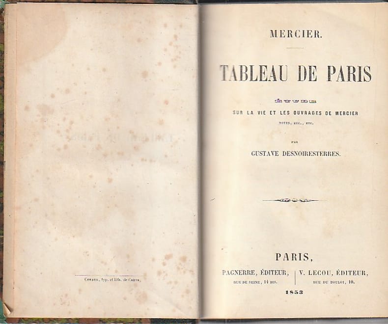 Première édition très peu commune de cet essai de critique du Tableau de Paris de Louis-Sébastien Mercier.Texte principal de Louis-Sébastien Mercier accompagné des commentaires du libraire Jean-Louis Natthey (1743-1814).« Sous couleur d'y ajouter des réflexions de sa façon, un inconnu réimprima en 1783 tout ce qui avait paru du Tableau de Paris en six volumes, où l'intention de débiter le bien d'autrui paraît dans toute son effronterie naïve, car le texte de Mercier y tient presque toute la place, et les critiques qui servent de prétexte au larcin sont courtes, clairsemées et généralement ineptes. On peut en juger par ce fait, entre autres, que le « Solitaire » comme il s'intitule, reproche à Mercier le sujet même qu'il a choisi, l'étude du coeur humain étant, à ce qu'il lui semble, plus facile au village, où tout le monde se connaît, qu'à Paris où chacun vit dans une solitude relative (...) à la qualité du dénigrement on reconnaît sans peine qu'il n'est question que de déguiser maladroitement un contrefaçon pure et simple » (L. Béclard).R.M. Tecoz, L'imprimerie à Nyon au XVIIIe siècle, Musée Gutenberg suisse, 1966, n°3-4, p. 159-179) ; Léon Béclard, Sébastien Mercier, sa vie, son oeuvre, son temps, d'après des documents inédits, I, Avant la Révolution, 1740-1789, p. 629.
