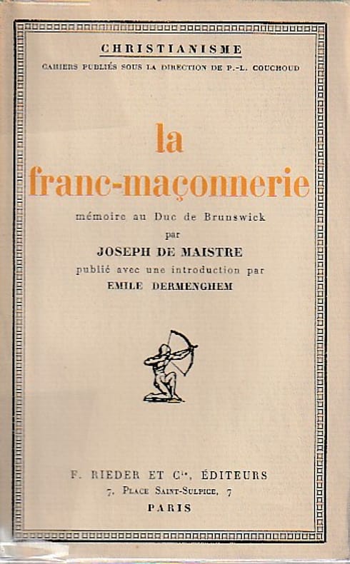 "N°6 DE ""CHRISTIANISME"" - CAHIERS PUBLIES SOUS LADIRECTION DE P.L. COUCHOUD. // NOTA : Le comte de Maistre, Grand'croix de l'ordre des Saints-Maurice-et-Lazare. Naissance. 1 avril 1753 (Chambéry). Décès. 26 février 1821 (à 67 ans) (Turin). Nationalité. Drapeau du Royaume de Sardaigne. Royaume de Sardaigne. École/tradition. contre-révolutionnaire, réaction, traditionalisme, royalisme, ultramontanisme.... La postérité a retenu de Joseph de Maistre qu'il a été l'un des plus fermes partisans de la contre-révolution. Ses adversaires l'ont peint comme un doctrinaire sectaire, pourfendeur des idées nouvelles. Ce portrait comporte une part de vérité : ennemi déclaré des Lumières, Maistre développe une philosophie de l'autorité.... Classification Dewey : 366.1-Franc-maçonnerie"