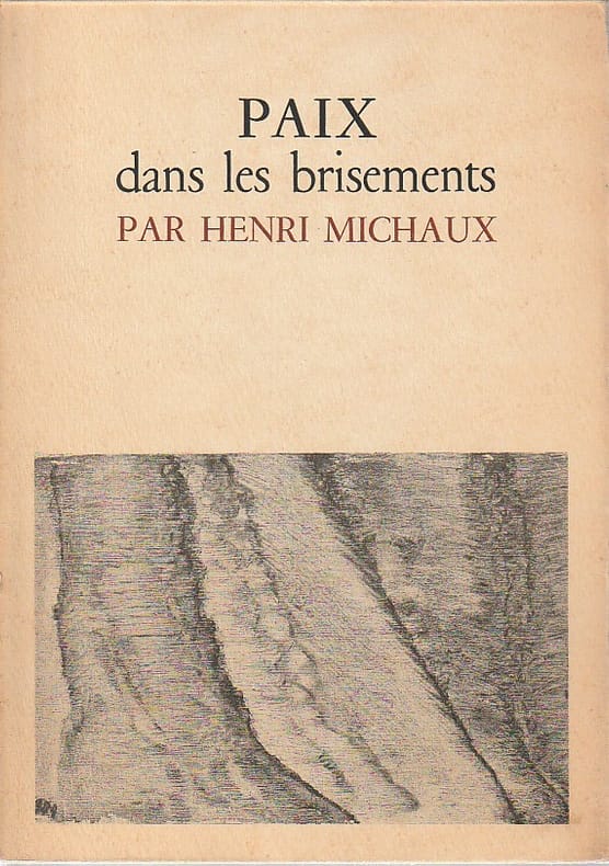 Paris, Flinker, 1959, in-32, 47 pp, Broché, cousu, couverture imprimée, Paix dans les brisements est un recueil de cadavres exquis, 14 dessins en noir d'Henri Michaux hors texte se suivant comme une histoire racontée, certains mots ou lettres que le spectateur devine s'y cachent. Un texte suit, Signification des dessins, l'artiste nous apprenant dans quel état il se trouvait au moment où il créait, à savoir qu'il était sous mescaline, nous expliquant son rapport au temps, au présent, à la transe, à la réflexion même dans ces moments où la réflexion est absente, laissant place aux images. Exemplaire numéroté 529 sur 1190 sur papier Robertsau. Bon état malgré couverture insolée. Couverture rigide