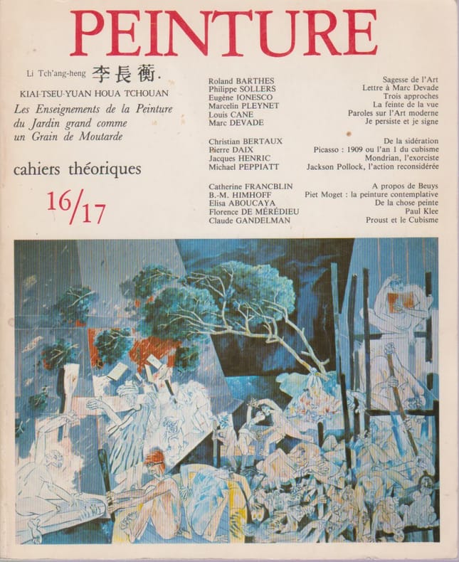Paris, "Peinture", mai 1983, 20,5 x 25, 254 pages cousues sous couverture illustrée. Au sommaire : Pierre Daix, Roland Barthes, Michael Peppiatt, etc. Iconographie en noir.