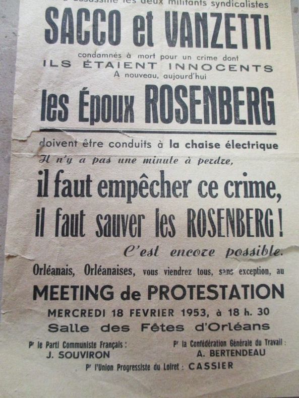 affichette du parti communiste (21,5cmX13,5cm) annonçant un meeting à Orléans le 18 février 1953 en faveur des époux Rosenberg