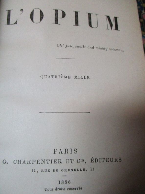 Table des matières: De l'opium - Dérivés du pavot et de l'opium - Emploi de l'opium en médecine - l'opium dans Pline - Les effets de l'opium - Pharmacopée d'Edimbourg et autres - Psychologie du fumeur d'opium - Les fumeries d'opium - l'opium interdit en Chine - la question de l'opium en Chine - de la thérique, sa composition - De la morphine et des morphinomanes - Anaphrodisie morphinique - Psychologie du morphinomane - Conclusion.