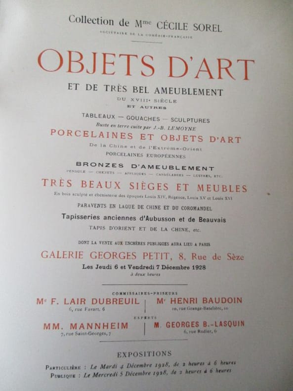 objets d art et de très bel ameublement du XVIIIe et autres - tableaux gouaches sculpture buste en terre cuite par jb lemyne porcelaines et objet d art de la chine et de l extrème orient très beaux sièges et meuble on joint la carte d entrée a l exposition particulière galerie Georges Petit...Celine emillie Seure dite Cécile Sorel (1875-1966) comtesse de Ségur comédienne française