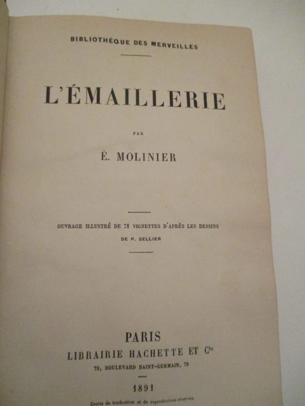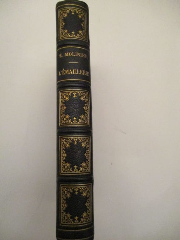 71 vignettes d'après les dessins de P. Sellier (de nombreuses planches dans le texte) 1ere édition, 1891 Contents, Chapitres : Notions préliminaires, définitions, procédés, division de l'ouvrage - 1. L'émaillerie dans l'Antiquité, Egypte, Grèce, Italie, les émaux dits gallo-romains - 2. Les émaux dans l'Empire d'Orient à partir du Ive siècle - 3. Les émaux en Occident à l'époque carolingienne - 4. L'émaillerie en Allemagne du XIe au XIIIe siècle - 5. L'émaillerie en France et en Italie du XIe au XIVe siècle - 6. Les émaux en Italie, en France et en Allemagne du XIVe au XVe siècle - 7. Les origines de la peintre en émail en France et en Italie - 8. L'émail peint en France au XVIe siècle - 9. L'émail peint à Limoges au XVIIe et au XVIIIe siècle - 10. Les portraits en émail au XVIIe siècle, les émailleurs genevois du XVIIIe siècle, Genève - Les émailleurs de Saxe - Appendice : De quelques émaux européens particuliers : Hongrie, Russie, Espagne - Les émaux de l'Extrême Orient - Conclusion très belle reliure en maroquin, intérieur frais et propre, papier à peine jauni