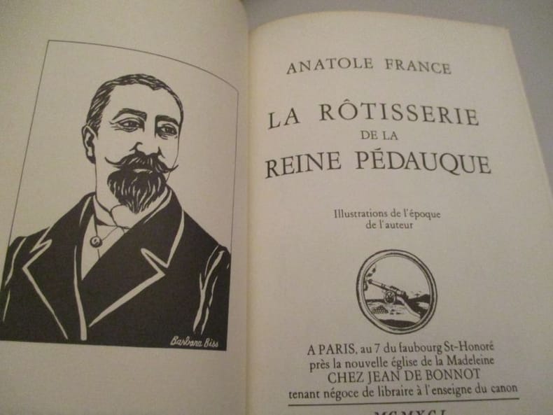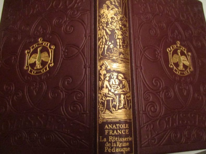 Imposant succès de l'auteur, La Rotisserie de la Reine Pédauque « la plus significative de ses oeuvres» est aussi celle de la maturité. À l'été, 1892, France, qui passe l'été avec sa fille Suzanne à Saint-Thomas, petite village de l'Aisne, termine cet imposant roman de plus de 600 pages. Le 10 août écri-il à un ami que sa reine Pédauque est «arrivé au 496° feuillet [...]. Le romancier a apporté son manuscrit dans sa valise ». En septembre, La Rotisserie est achevée et dès le 6 octobre elle commence à paraître en feuilletons dans L'Échos de Paris. Les origines du plus célèbre des romans de France puise allègrement dans les oeuvres les plus singulières du XVIIIe siècle, époque qui eût toujours sa préférence. Le personnage de l'abbé Coignard, le rôtisseur de la rue Saint-Jacques, maître Léonard et d'autres encore tout aussi savoureux ornent cette oeuvre qui inquiéta son auteur jusqu'à sa première publication. Le 5 octobre 1892, pris d'un doute affreux alors que L'Échos en publie les première pages, il écrit à sa confidente Madame de Caillavet «La Rôtisserie est toute à refaire. Je suis accablé...» Le 22 mars 1893 le texte paraît en volume chez Calmann Lévy. L'on sait la suite et son succès. Peu de titres dans la littérature de la fin du XIXe on connût un tel engouement, y compris bibliophilique. Outre les retirages nombreux et les éditions illustrées, les collectionneurs donnèrent aux plus grands ateliers cette Rotisserie qui fut admirablement et précieusement reliée. L'éditeur fit imprimée 20 japon et 40 hollande sous couverture orange - pour ne donner qu'un exemple citons celui de l'exemplaire du Bourg de Bozas sur japon relié par Meunier, assez dans le goût de l'époque. Il est amusant de noter enfin, que le libraire Conquet, avisé et prudent, à la suite de cet impressionnant succès, souscrivit auprès de l'éditeur à tous les futurs grands papiers des oeuvres de France. Le billet conservé dans cet exemplaire est adressé au poète algérianiste Albert Tustes (1888-1943). Il est l'auteur des Sirénéennes lauréat du grand Prix de l'Algérie en 1927.