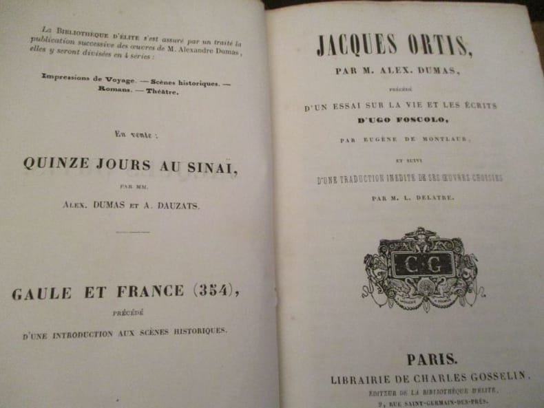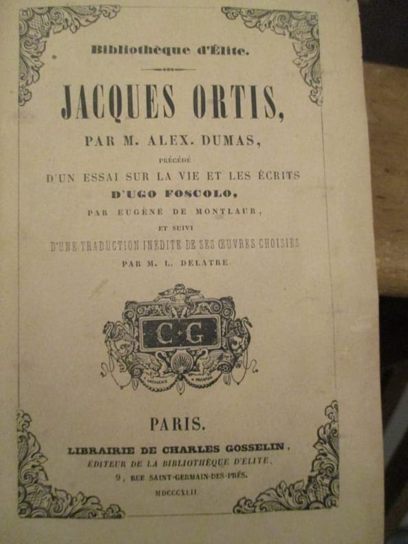Première édition in-12° augmentée. Préface de Pier Angelo Fiorentino qui précise qu'il s'agit dune adaptation des "Ultime lettere di Jacopo Ortis" d'Ugo Foscolo, suivi d'une sélection d'oeuvres choisies du même auteur: Discours de Bonaparte au Congrès de Lyon - Les tombeaux - Réponse aux tombeaux - A Sylvia, après une maladie - Le soir.(Munro, "Dumas", p. 788). Exemplaire du grand bibliophile, député de la Manche et filateur Louis-Hippolyte Rangeard de La Germonière (1807 - 1887), avec son ex-libris imprimé. Ses livres ont été vendus à Paris en 1966.Très bon exemplaire, très bien relié à l'époque.