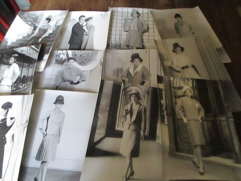 L'ensemble, s'ouvrant sur une photo de Véronique nue (bébé !), concerne principalement la Maison Carven, dont Véronique était l'un des mannequins vedettes (dont 2 clichés la représentant avec Madame Carven), mais aussi pour Givenchy (3 très beaux clichés), Jacques Griffe, Balmain. Une photo en couleur représente Madame Carven dans les années 60, 9 clichés représentent des personnages en costume du XVIIIe siècle. Les coupures de presse concernent des voyages et visites professionnels (Brésil, château de Versailles), des articles sur la mode (dont une série de maillots de bain de Carven), une course de mannequins en talons aiguille dans Paris !...Très bel ensemble, très intéressant pour l'histoire de la mode des années 50.