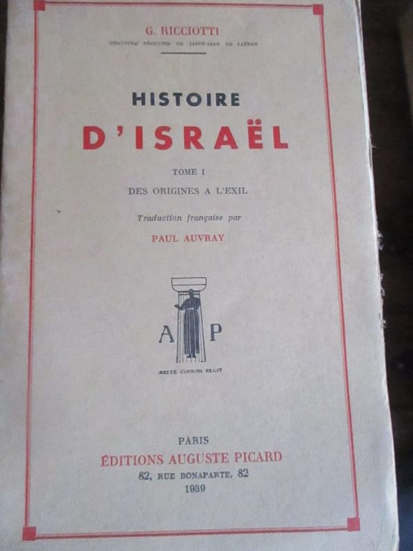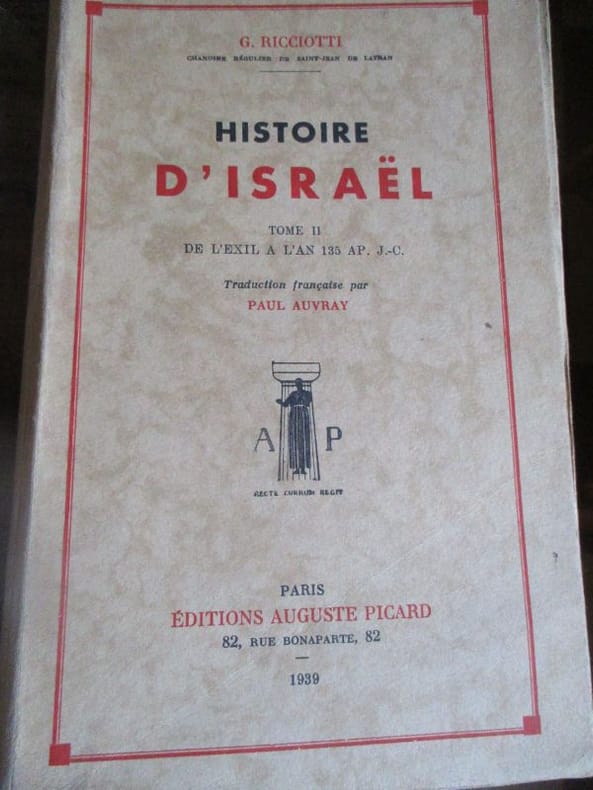 Tome I seul (sur 2) — Traduction d'un ouvrage italien estimé, établie sur la 2e édition italienne. Cette première édition française de l'ouvrage était presque épuisée lorsqu'en 1942 les exemplaires restés en magasin furent brûlés par les Allemands... — "Le premier volume de l'Histoire d'Israël du chanoine Ricciotti avait paru en Italie en 1932. Le monde savant lui avait fait un accueil favorable et depuis lors trois éditions se sont succédées sans épuiser le succès de l'ouvrage. En France, aucun auteur catholique n'a osé s'attaquer à l'ensemble de l'histoire du peuple hébreu. Le livre magnifique et de toute première valeur de M. Desnoyer ne commence qu'à la période des Juges pour se terminer à la mort de Salomon et d'autres publications ne sont que des histoires saintes au sens péjoratif du mot. Ce n'est donc pas une vaine formule de dire du travail de M. Ricciotti qu'il comble une lacune. Dans ce premier volume, après une introduction d'une centaine de pages qui nous présente le « complexe historique » où a vécu le peuple hébreu, ses voisins, la Babylonie, l'Assyrie et l'Egypte, Canaan qui a si fortement influé sur lui, l'exploration archéologique et les sources historiques, l'auteur commence avec la vocation d'Abraham l'histoire du peuple choisi. Il nous décrit successivement les migrations des patriarches, le séjour en Egypte, l'établissement en Palestine, l'institution de la royauté, les royaumes d'Israël et de Juda jusqu'à la captivité... Des illustrations bien choisies, des tableaux et des cartes, un index parfaitement dressé, font de cet ouvrage, un commode instrument de travail." (Albert Vincent, Journal des savants, 1939)
