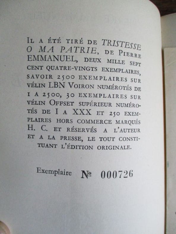 Paris, Fontaine, 1946, in-8, 122 pp, broché, couverture imprimée rempliée, Édition originale, un des 250 exemplaires hors commerce réservés à l'auteur et à la presse, marqués H.C. Exemplaire enrichi d'un envoi signé de l'auteur à Maurice Blanchot, romancier et critique littéraire, et contenant la fiche de présentation de l'ouvrage par l'éditeur. "Tristesse ô ma patrie" est le dernier volet des oeuvres de la Résistance de Pierre Emmanuel, ce recueil comporte sept sections, regroupant chacune des poèmes partageant une thématique commune, comme notamment, présents de manière récurrente les thèmes de la répugnance et de l'horreur devant les atrocités de l'occupation et la dénonciation de la barbarie de la guerre. Bel exemplaire. Couverture rigide