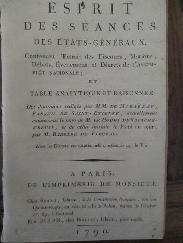 A Paris de l'imprimerie de Monsieur chez Berry, libraire a la constitution française rue des quinze vingts, au coin de celle de Rohan, maison de l'oiselier No30 à l'entresol 1790 In8 broché 72 pages